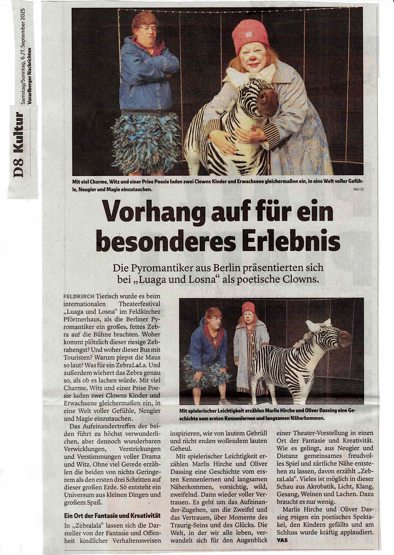In "ZebraLala" lassen sich die beiden Darsteller*innen von der Fantasie und Offenheit kindlicher Verhaltensweisen inspirieren. Mit spielerischer Leichtigkeit und feinster Körperkunst erzählen sie eine Geschichte vom ersten Kennenlernen und vom langsamen Näherkommen – mal vorsichtig, mal wild, mal zweifelnd, mal voller Vertrauen.